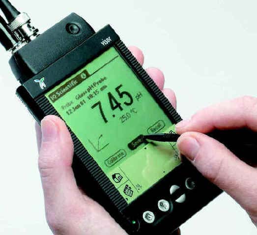 The IQ400 pH system is both pH meter and handheld computer. The meter accepts both glass and non-glass electrodes. The meter is easy to use and features touch screens, pop-up windows and on-screen help tips and troubleshooting guides for each function. The "eDoodle", a virtual sticky note, allows you to save handwritten notes and sketches with your pH readings. You can run all Palm OS applications, such as advanced scientific calculators and spreadsheets. You can download saved records to your computer with the push of a button.